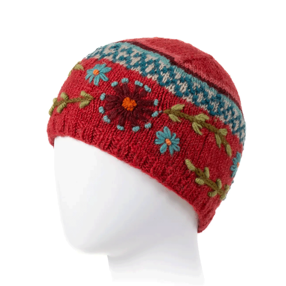 Exquisite Embroidered Wool Hat - Red Floral, Nepal