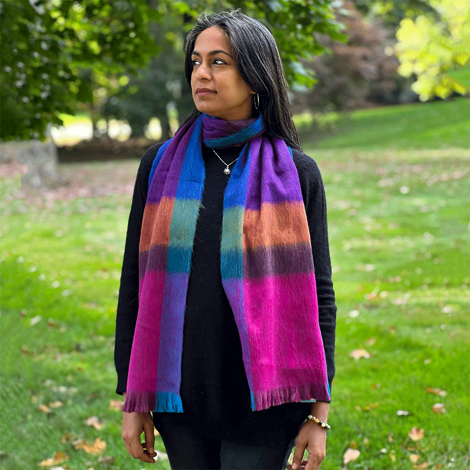 Our best selling Luxurious Alpaca Scarf is now available in this gorgeous, bright, multi-colored plaid design. Soft and cozy, this brushed alpaca scarf makes a wonderful gift.