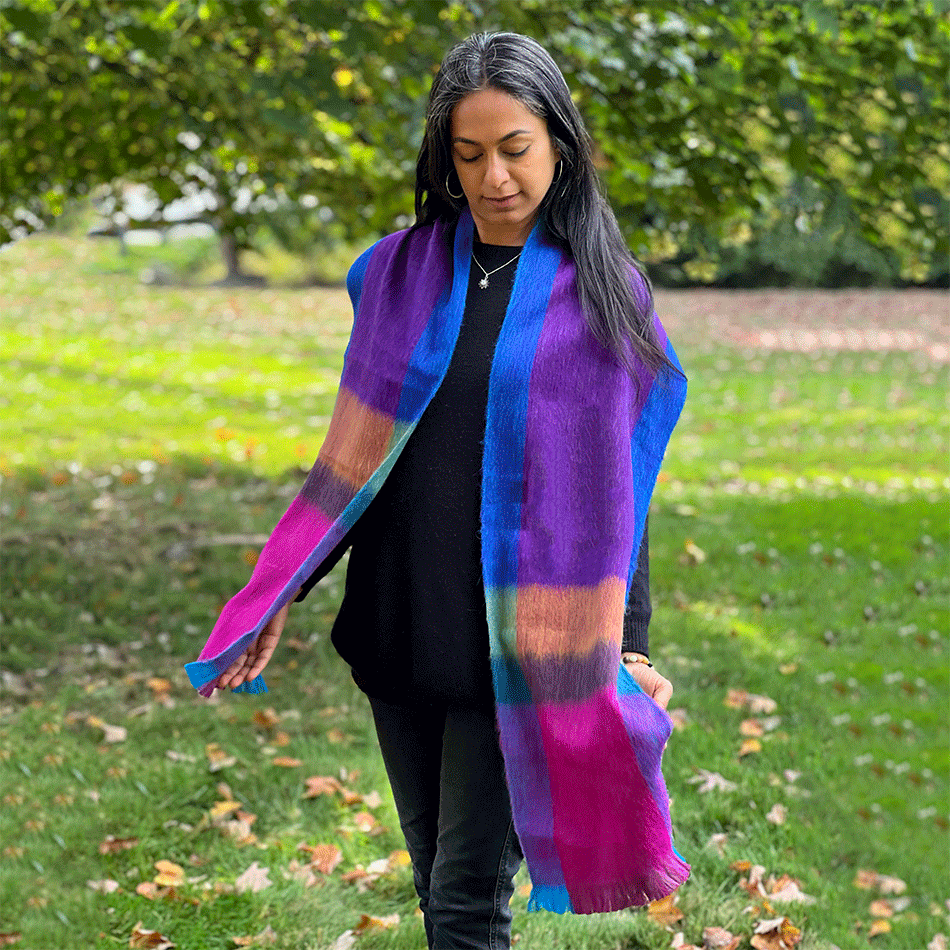 This scarf was handmade in a fair trade cooperative in Ecuador. The indigenous artisans use age-old, traditional weaving techniques combined with contemporary styles and colors, to create gorgeous products for a Western marketplace. The scarves are handwoven on a wooden loom using methods that have been employed for hundreds of years. The artisans are paid excellent wages, and have seen their lives greatly improved through fair trade practices.