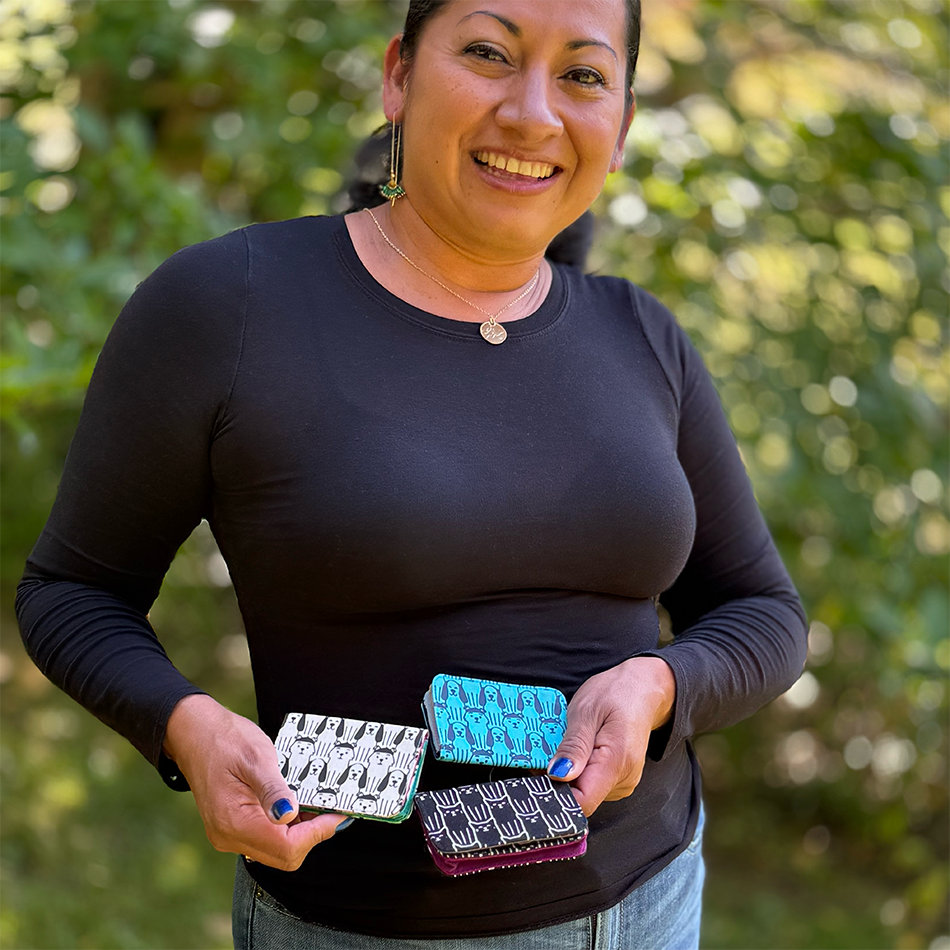 Recycled cotton; Vegan; snap button closure; two ID/credit card slots.