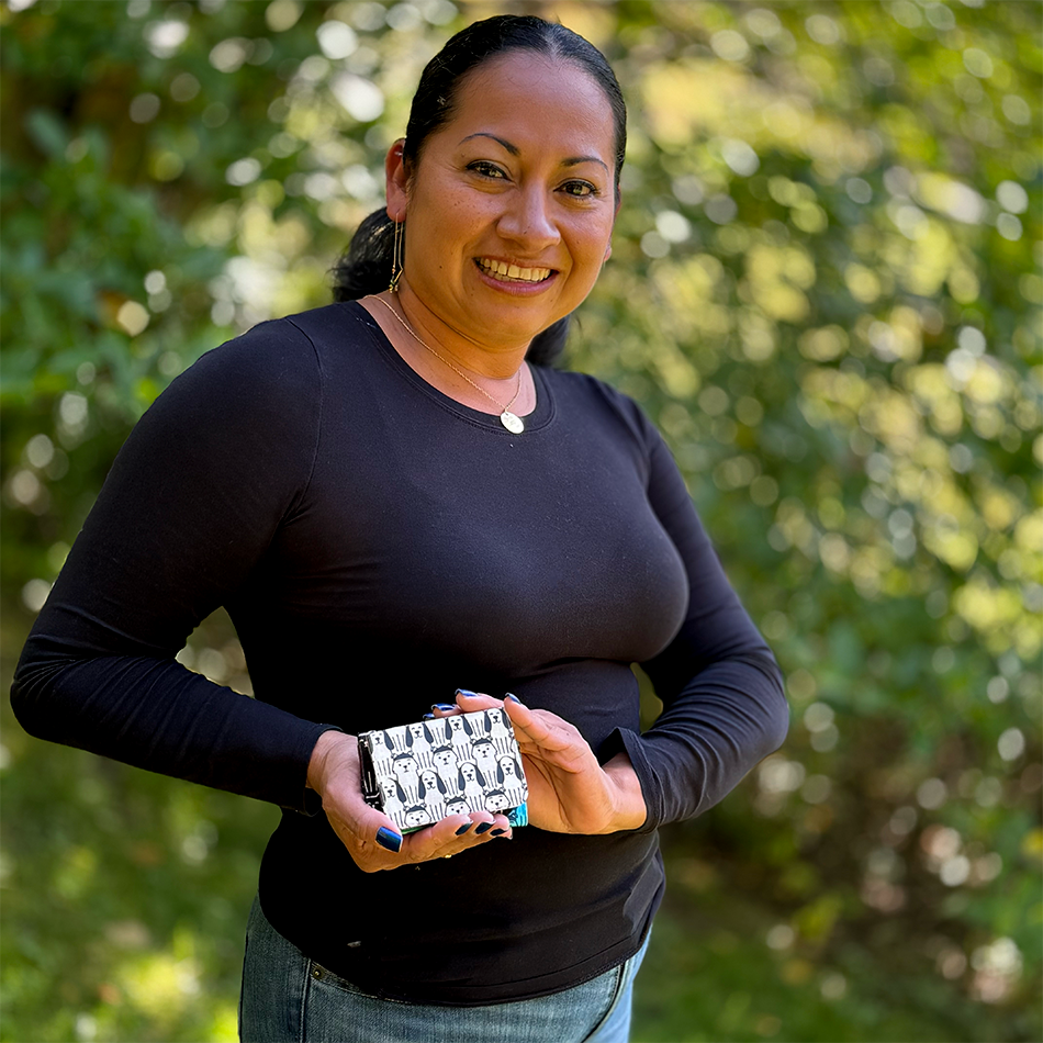 Recycled cotton; Vegan; snap button closure; two ID/credit card slots.