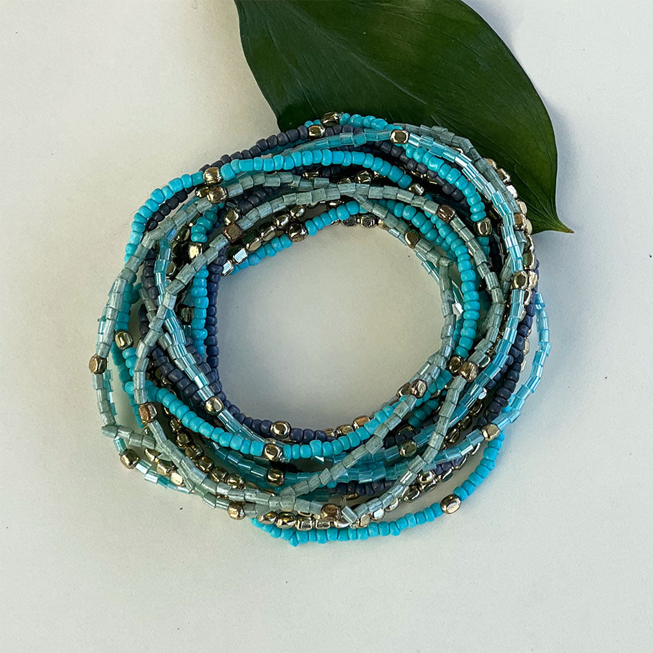If you love beads and statement bracelets this is the one for you. This set of bracelets features several strands of tiny glass and metal beads on stretchy elastic bands.