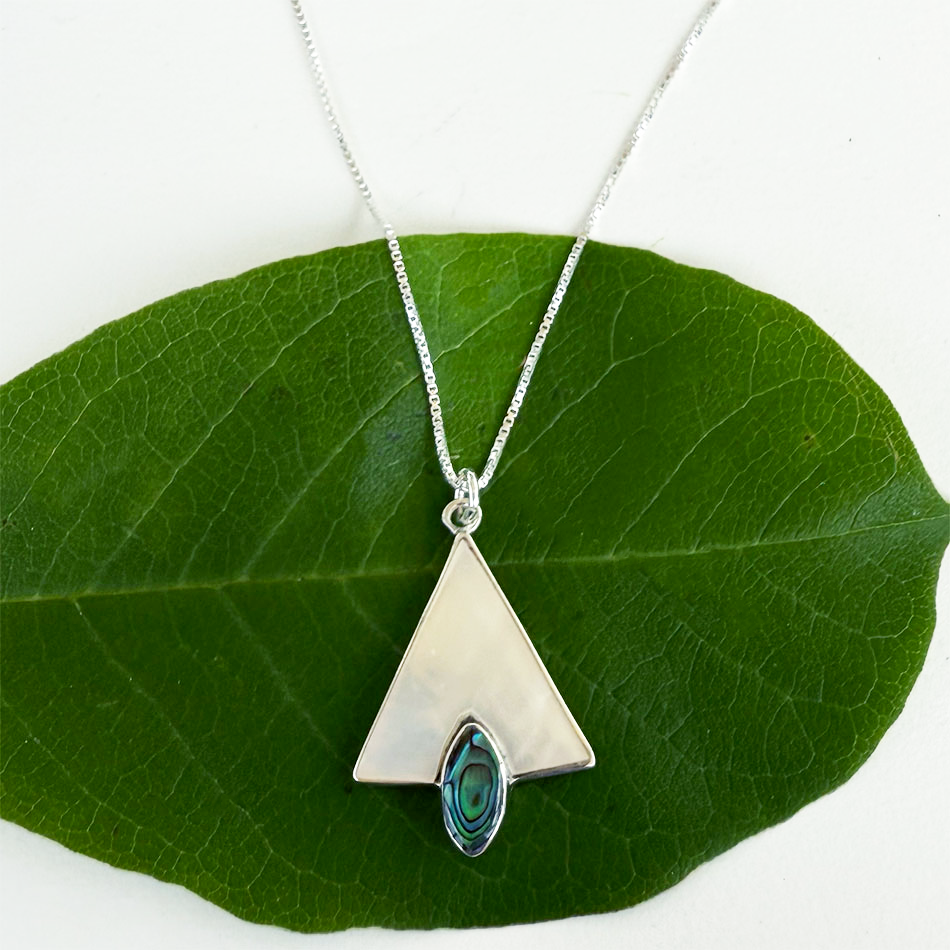 This exquisite fair trade necklace features Mother-of-pearl and abalone shell encased in a sterling silver frame. Unique and truly elegant, this unique pieces is a real stunner.