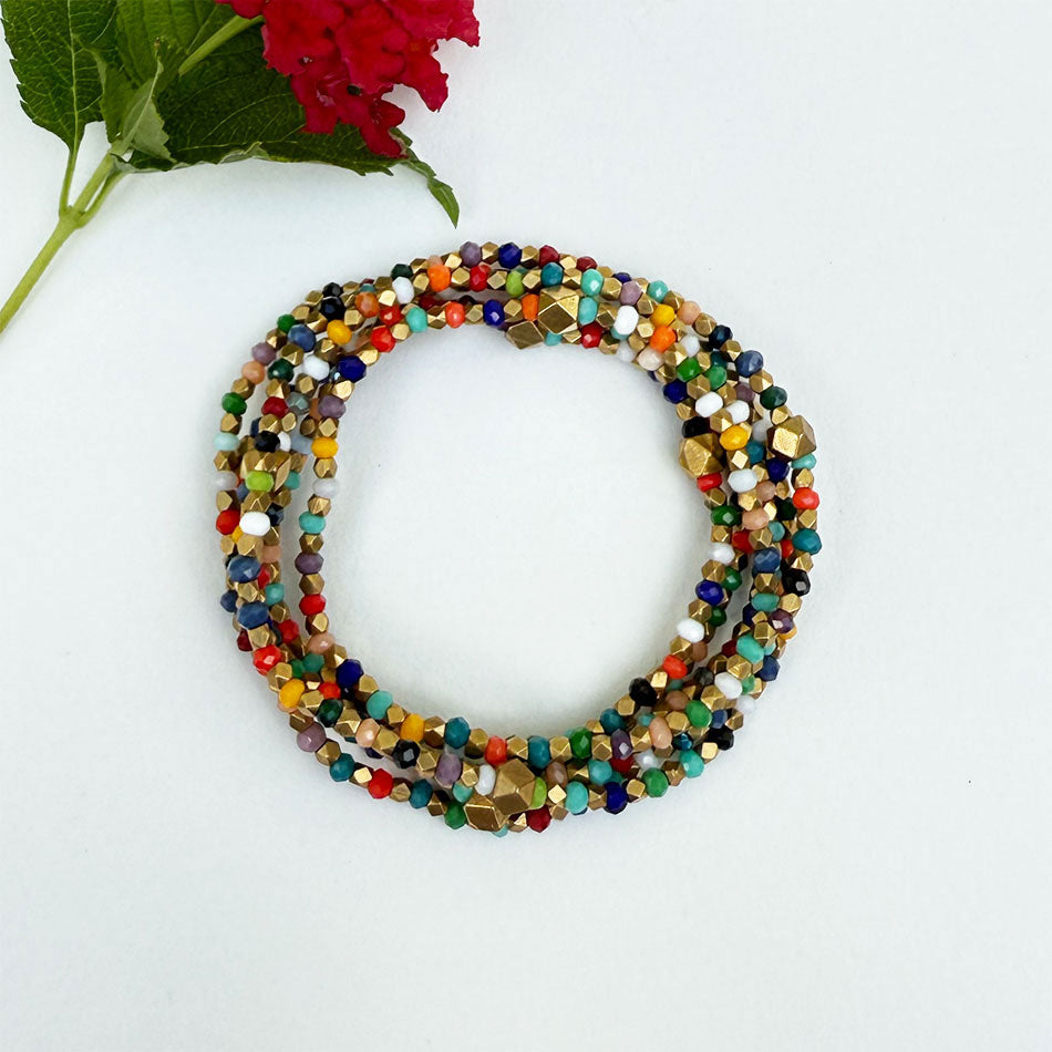 This fun, festive piece will brighten up your day - and your outfit. It features an elastic cord with cut glass beads in an array of colors, interspersed with bright gold shiny beads. Ethically handmade by women in India, this piece can be worn as a bracelet or necklace.