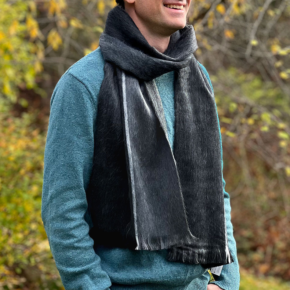 We love the neutral shades of gray and black in this stunning alpaca scarf.  Men and women alike will gravitate toward this one, as it goes with everything.