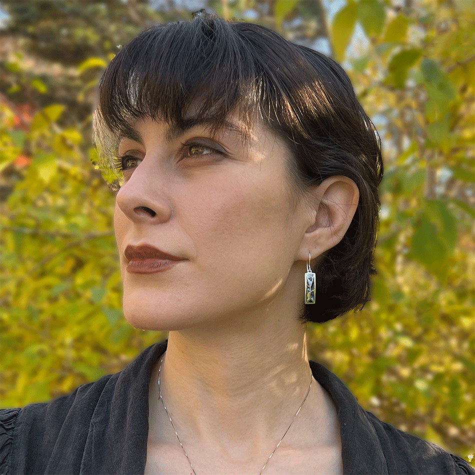 These exquisite earrings feature abalone shell encased in sterling silver, creating a unique mosaic-like design.