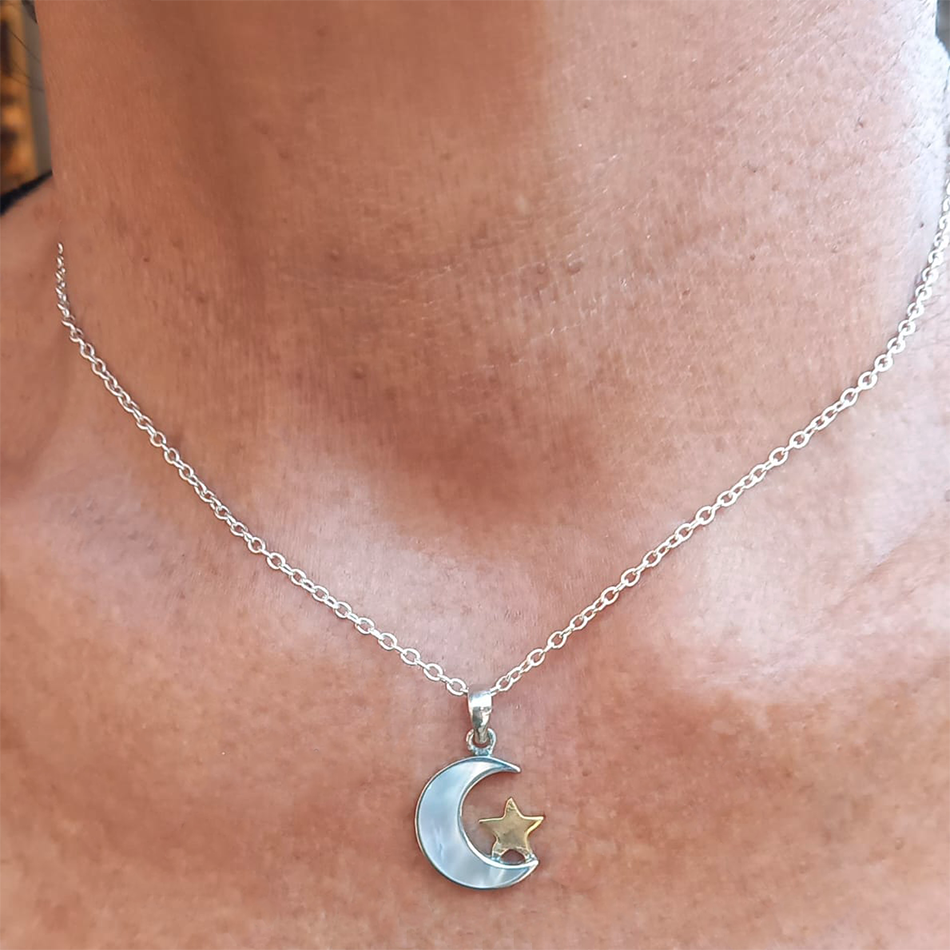 This exquisite little necklace features a crescent moon sterling silver pendant with inlayed mother-of-pearl and a brass star. This beautiful fair trade piece looks great alone or layered with other favorites.