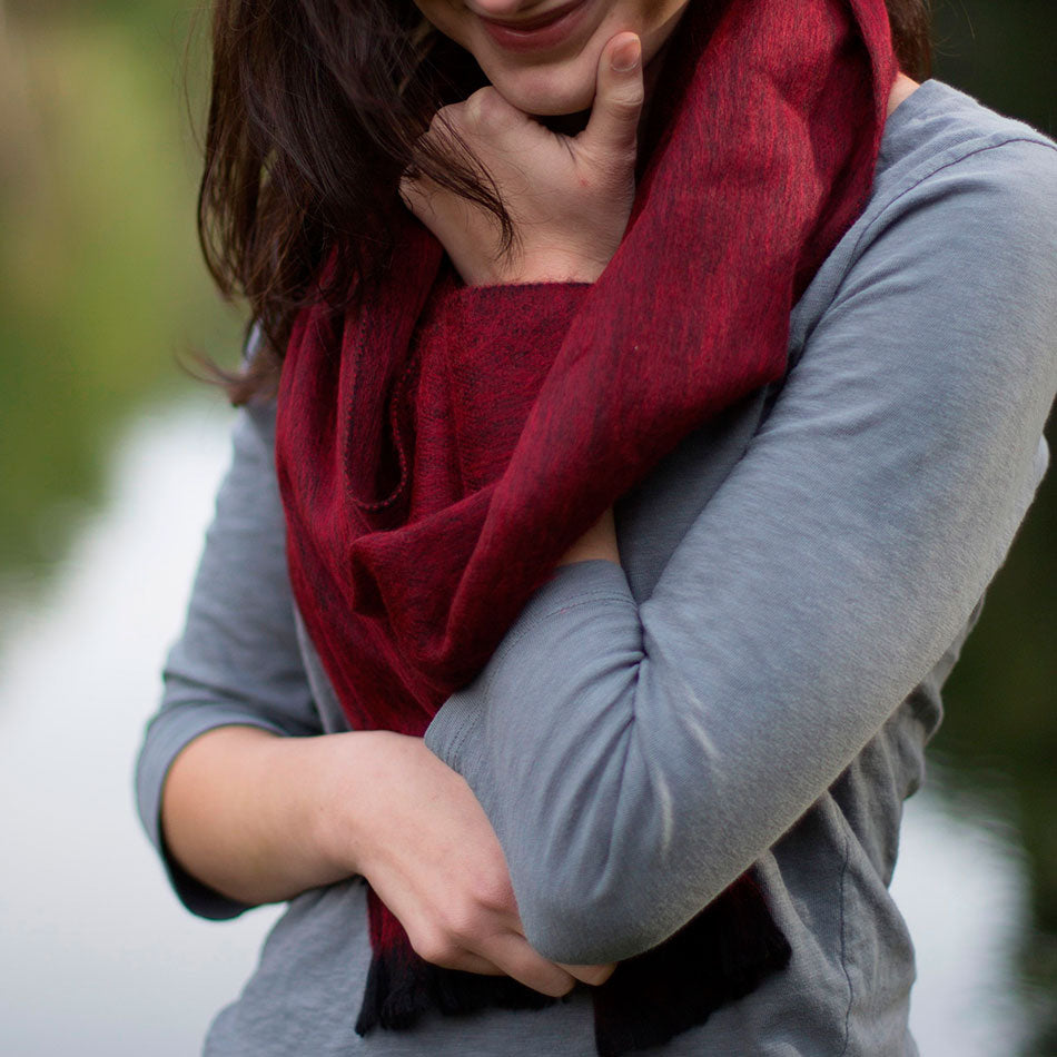 This beautiful alpaca blend scarf is soft and cozy. This one is a stunning shade of red with a touch of black which can be seen in the fringe.