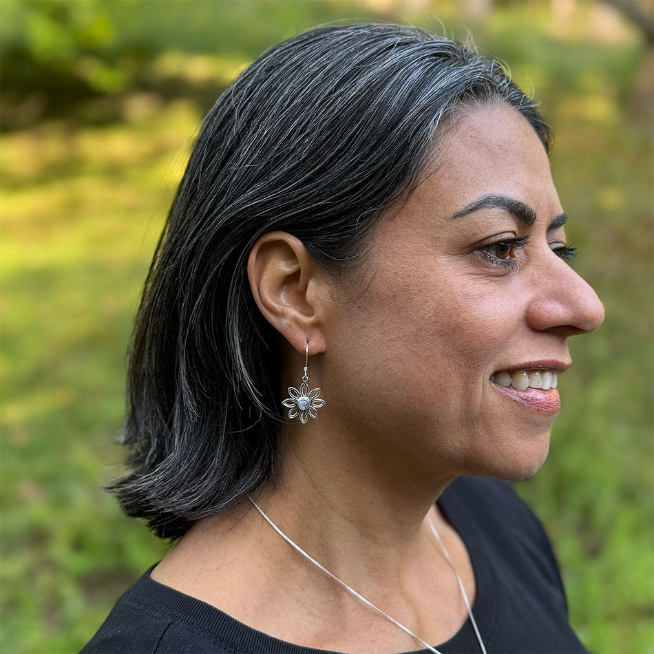 These exquisite sterling silver earrings feature an etched sterling silver flower with a rainbow moonstone in the center. Cheerful and beautiful, these fair trade earrings will feel great to wear.